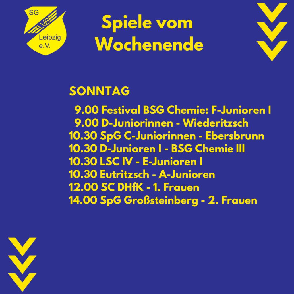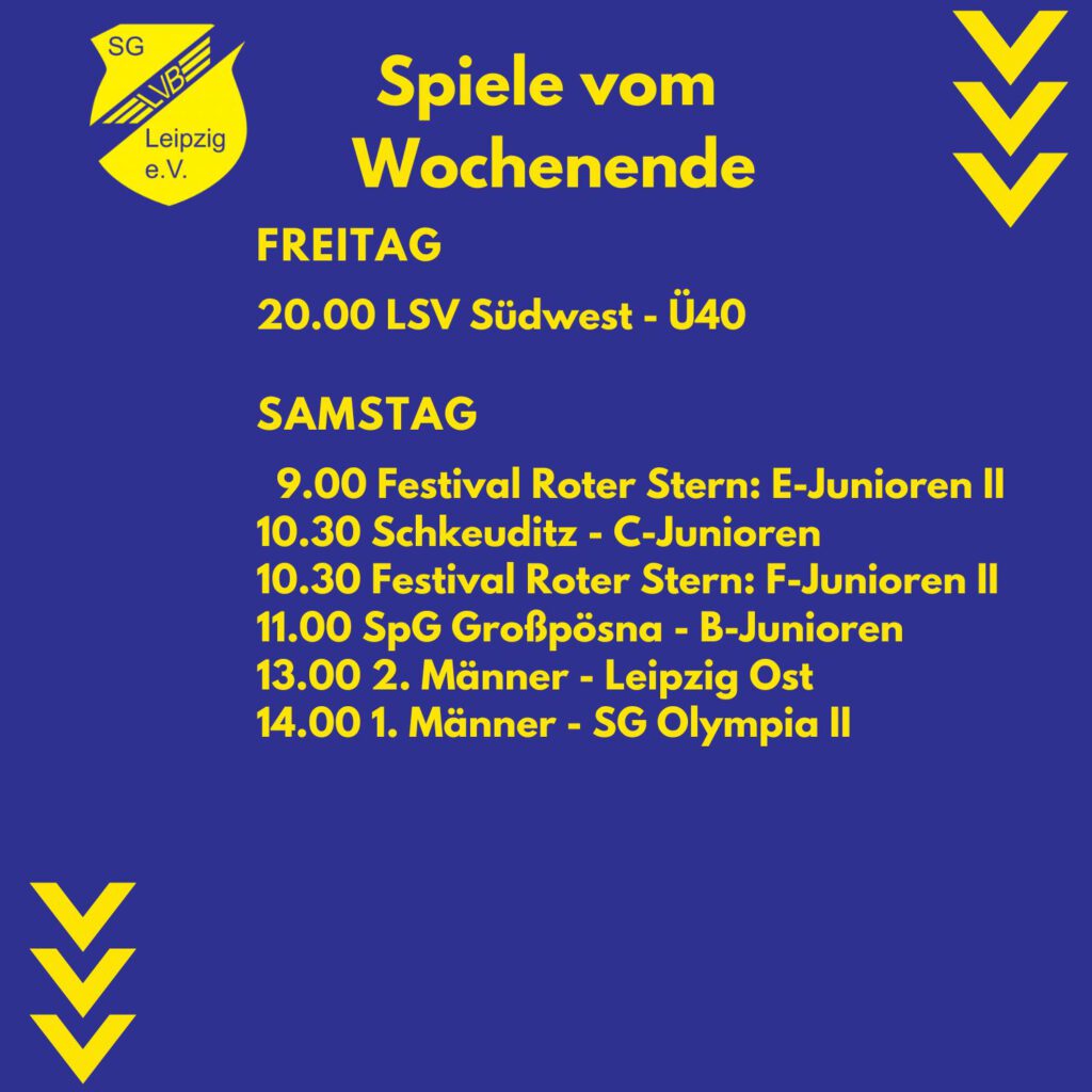 Die Plätze geben es (noch) her: volles Programm von Freitag bis Sonntag! Am Sonnabend dürfen wieder die 1. und 2. Männer nacheinander an der Neuen Linie aufdribbeln! Am Sonntag sind dann die D-Junioren und -Juniorinnen bei uns zu Hause am Ball. Lasst die Punkte im Connewitzer Holz! 🙂