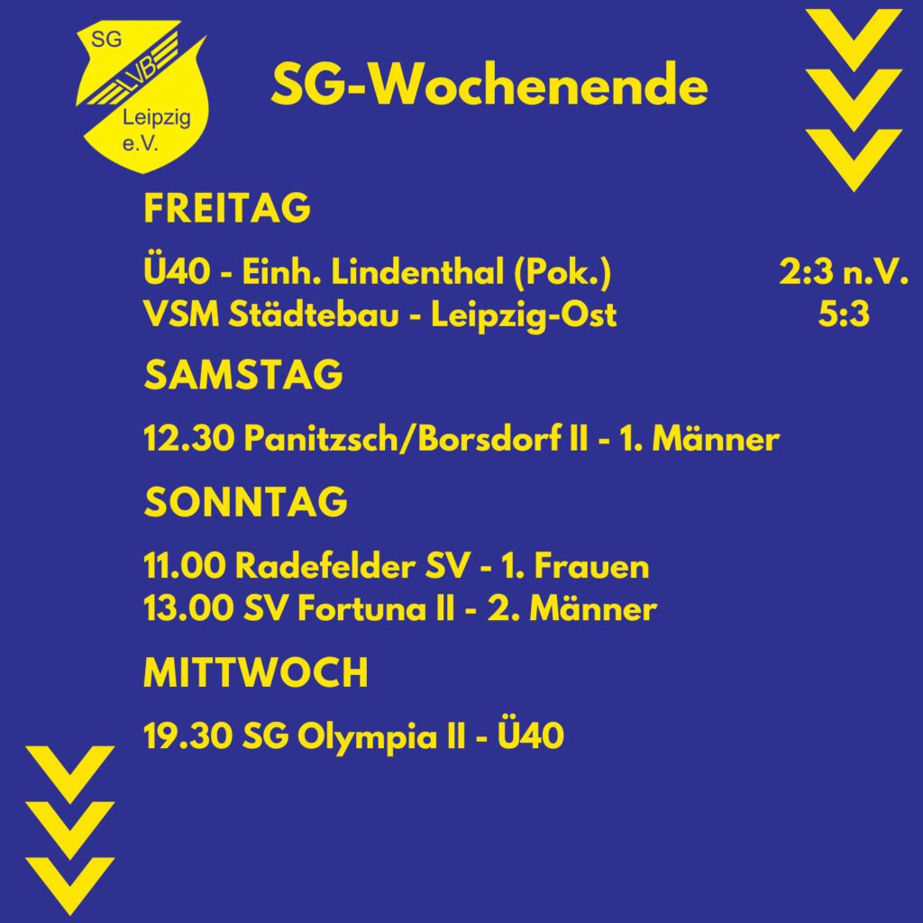Noch haben wir am Wochenende ein überschaubares Tableau der SG-Partien, das wird sich nächste Woche ändern, wenn die Ferienzeit vorbei ist. Nach dem heutigen Freitag stehen noch vier Spiele an. Wir drücken die Daumen und freuen uns auf ein sonniges WE!